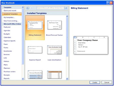 Click on Installed Templates. This will give you a list of templates you can uses that are already installed on your computer and you do not have to download from the internet. These can be time savers if you are in a hurry to create a professional looking spreadsheet with the formulas already in place.